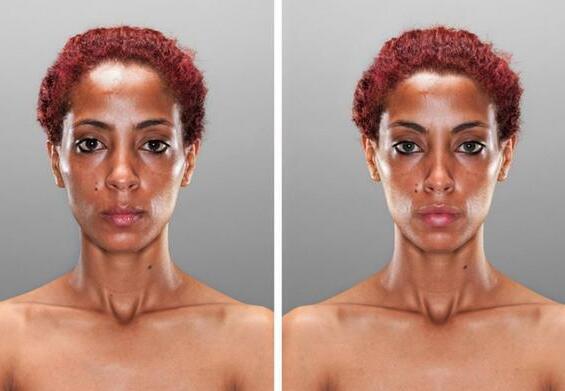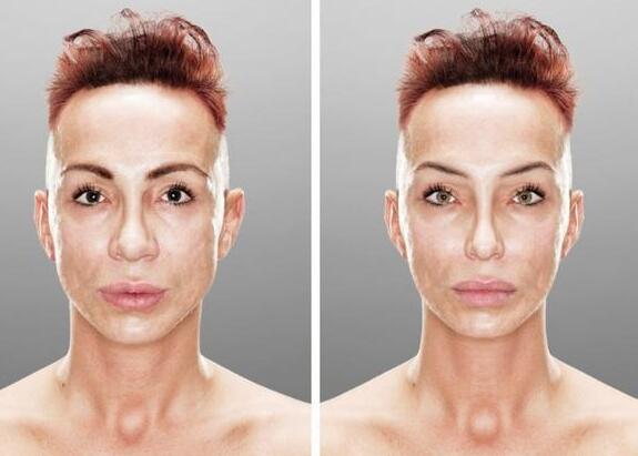这位女士眼中的自己是皮肤白一些,腮帮小一些,实际相反。