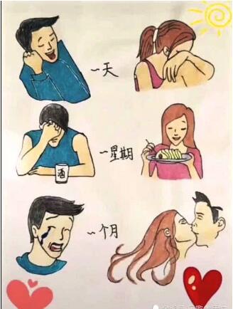慢慢的双方都能够缓过劲儿来了,男生蹦迪玩一些刺激的游戏转移自己的注意力,等静下来的时候心里满满的都是想念,看到和女生有关的事物可能会大哭一顿哦,女生会缓过劲儿来,开始全新的生活,因为女生身边朋友多,安慰她的人很多,会比男生恢复的快一些。