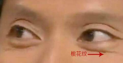 桃花纹是在眼肚部位,如果这条纹路过了眼尾部,表示自身桃花极其旺盛,与异性很有缘分;如果把持不住,容易拖泥带水,但是好色胆子却很小,虽然怕自己的对象,但是又喜欢偷偷摸摸,以为天衣无缝,如果身边的男子出现这种特征就需要注意了。