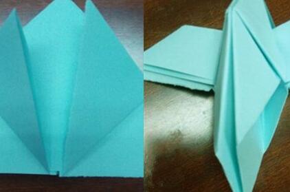 正方形裁好了之后,两个角对折后要开,再以两个三角形为准,在另两个三角形的中心向里叠,就叠成了如右图的样子。