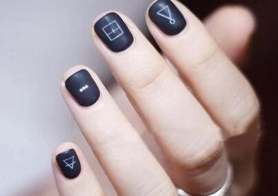 几何图形的添加可以直接用贴纸,省去了自己绘画的麻烦。神秘的几何图形没有规律,同时也带来了神秘色彩。符号在美甲上的点缀往往会带来俏丽的青春感,而且造型简单,是刚入门的美甲diy可以尝试的方法。