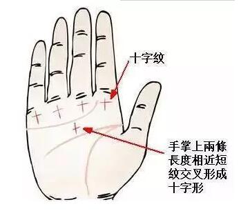 7、偏财型小指根部水星丘与无名指根部太阳丘之间的部位如有出现十字纹,表示易有意外,最近自己财路不顺,总遇麻烦,运势不详等类似情况。
