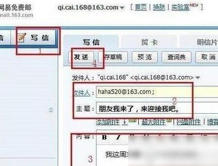 如上图的步骤所示例。先登录网易邮箱http://email.163.com/进入后即可开始写信。首先1、点写信,2、然后写收件人的邮箱和主题,如