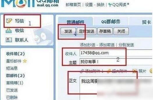 1、点写信,2、写收件人的邮箱地址和主题,用的是QQ的邮箱就写如97337187 qq.com,新浪的邮箱就写xxxxx xina.com等。QQ邮箱也可以直接从右边的QQ好友里点击联系人,就会自动填在收件人地址栏里。写好后点发送就可以了。