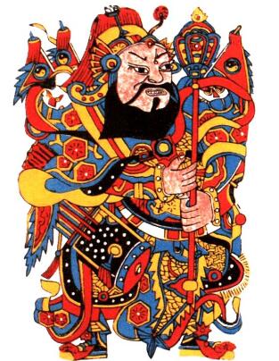 尉迟恭也是隋末唐初的名将,纯朴忠厚,勇武善战,一生戎马倥偬,玄武门之变时助李世民夺取帝位。其人面如黑炭,擅使铁鞭,骑乌骓马,据《西游记》中所言,尉迟恭与秦琼因保护唐太宗李世民免于龙王鬼魂之犯,成为两位道教传统门神。尉迟恭年少时曾是铁匠,所以后世铁匠也常奉之为职业守护神。
