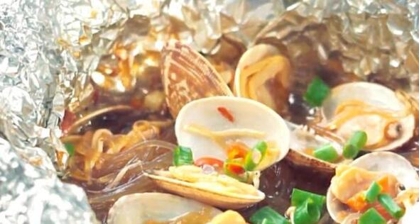 5,锡纸分光面和亚光面,一般光面在外哑光用来接触食物。把锡纸叠成一个容器,留一个小开口,加入花甲,小芹菜段,金针菇,辣椒,红油,蒜蓉酱,鲜辣酱,胡椒粉,五香粉,蒸鱼豉油,陈醋,粉丝,加入熬好的鲫鱼大骨汤,把开口封好,燃气上放一个铁板,再放上锡纸花甲,开大火煮三分钟,煮到花甲开口就可以了,起锅的时候加入少许的花椒油拌匀,再撒上一点香菜,一份非常好吃的锡纸花甲就做好了。