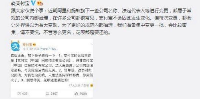 【导读】支付宝公司更名了?官方回应:反正不管怎么更名,花呗是要还的。支付宝更名为瀚宝公司,这又是哪波操作?不管怎么操作,欠支付宝的一分也不能少还。