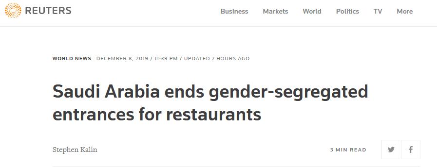 ABC将上述新规形容为“取消餐馆种族隔离的决定”。路透社也提到,过去一年,随着沙特餐厅、咖啡馆、会议中心和音乐厅不再严格执行种族隔离政策,种族隔离现象已悄然减少。