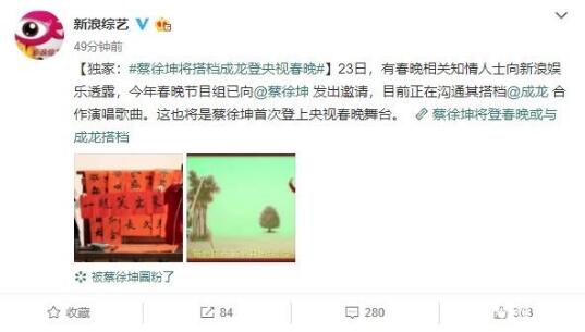 1月23日晚,有知情人向媒体透露,2019春晚节目组已向蔡徐坤发出邀请,目前正在沟通其搭档成龙合体登台表演唱歌。在前几天,蔡徐坤与成龙刚刚搭档为电影《神探蒲松龄》献唱了《一起笑出来》,该影片也是贺岁档电影,而歌曲《一起笑出来》也非常有过年的气氛,二人合作登台将演唱这首歌曲。此次也是蔡徐坤第一次登台春晚,也是唯一一个出道不到一年便登上春晚舞台的明星,尽显优秀。
