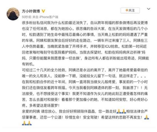 对于谭松韵而言,这件事情的打击还是很大的,只能希望现在的谭松韵能振作起来,好好的生活。妈妈的离世,对谭松韵绝对是沉重的打击。就在妈妈出事的前几个小时,她还在微博晒自拍,跟大家分享祝福。方小叶也说这也是为什么自去年跨年自拍之后,谭松韵再也没有发过微博。去年5月31日是谭松韵的生日,谭松韵还发微博感恩了妈妈,何炅、钟楚曦等圈内好友也一起祝谭松韵妈妈生日快乐。