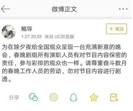 春晚导演称“往年也出现过因为过度剧透而不得不删减或更改节目内容的情况”,随后,工作人员发文,呼吁请大家尊重工作人员的劳动,勿对节目内容剧透,“春晚剧组所有演职人员有对节目内容保密的责任,参与彩排的观众也一样”。