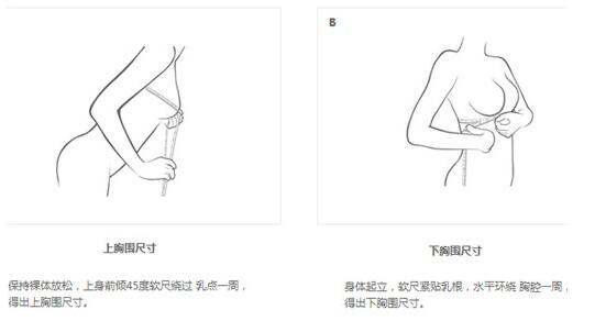 要想知道我们自己的胸部尺码,就需要先测量,我们需要测量两个数据:上胸围和下胸围。先说明一点,必须裸体测量,这样才会更准确。上胸围就是围绕我们两边乳头至后背一周的数值,四舍五入取厘米为单位,需要注意的是测量上胸围应该身体前倾45度左右再测量,至于原因是因为有些女性的胸部是有点下垂的,例如纺锤形的胸部就是有点向下的,如果水平测量会偏小。然后测量下胸围,也就是围绕我们乳房根部到后背一周,同样取厘米。如果想要更准确,大家可以多次测量取平均值。具体方式大家参考下图。