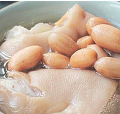 第四步,准备好炖锅将猪蹄还有花生放进去开始炖煮,先烧开了再用文火烧煮60分钟加上盐就行了。