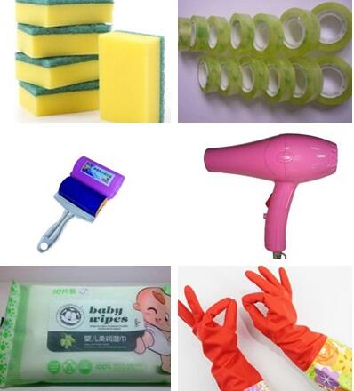 现在超市里有卖多用途粘胶除尘器,其实跟双面胶差不多,不过因为是滚筒,所以只需在晒干的衣服上来回滚几次,把纸屑都黏附了即可。