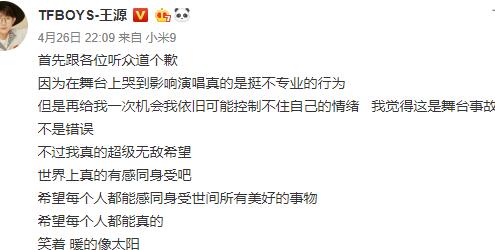 26日晚,王源就此事发文致歉,承认是舞台事故但不是错误,并表示若再给一次机会(演唱)可能依旧控制不住情绪。