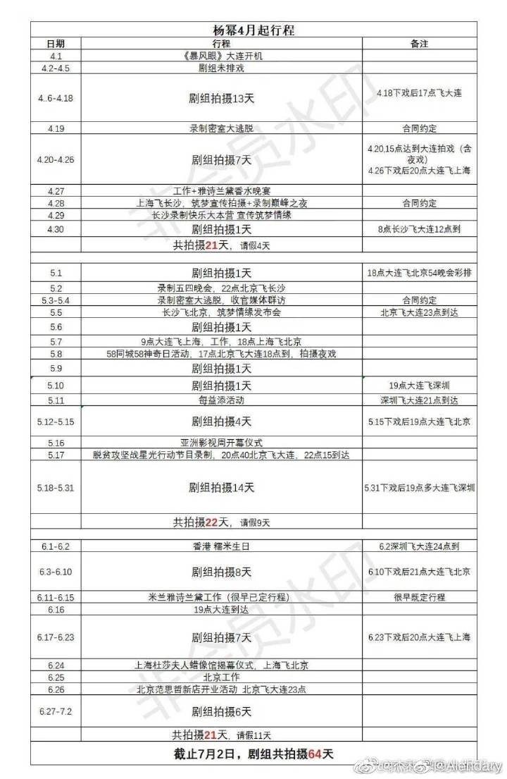 近日,有娱乐博主爆料指《暴风眼》开拍三个月,主演杨幂只在剧组呆了50天,剩下的42天全部请假在外捞金。7月3日,杨幂所属公司嘉行传媒向某媒体回应了此事,否认所谓“杨幂频繁请假外出捞金”,表示“杨幂在剧组拍摄期间,时间安排均以剧组需求和拍戏工作为第一优先……但所谓请假42天的说法纯属不实,刻意模糊和夸大了时间,完全是假的。”另外,杨幂出组工作,一是应其所参加的影视剧项目邀请配合宣传,二是为完成开机前早已签订的工作合约内容(与剧组签订合约时,均已注明)。