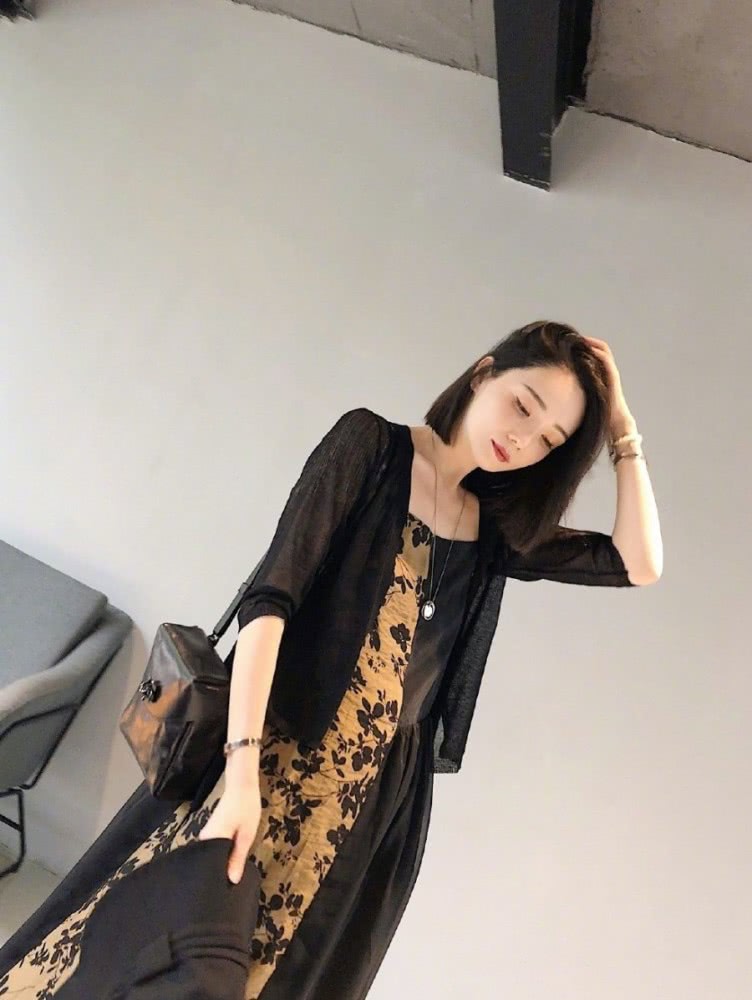 夕又米应该算是一个比较小女人然后气质类型的,这件黑色的小披肩就很能凸显气质,内搭一条拼接裙子,同是黑色的元素就更加和谐,内搭裙子的拼接土黄色底色和黑色的印花,让整体更加有色彩的丰富感和搭配层次感,如果只是全黑就会有一点点 的单调感。