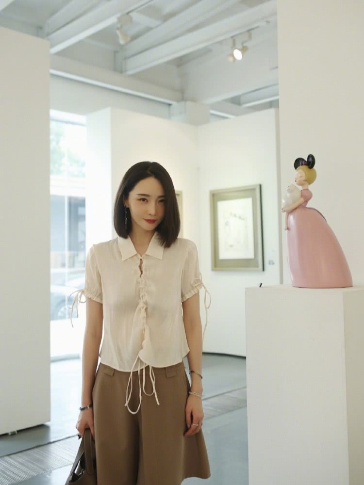 夕又米白色衬衫搭配卡其色半身裙,也还是自然小女人的气质,短袖衬衫的设计就比较独特,在袖口和纽扣的地方都设计了抽绳系带,显得更加自然随意带有一点小仙气。随意把上衣放在裙子外面,和一般的上衣塞进裙子里面显腿长穿法不太一样,显得更加独具特色。