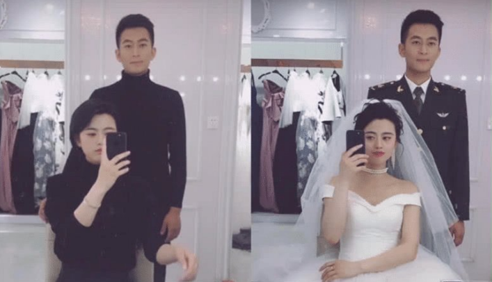 先来看看图中的这一对情侣,两个人也是马上就要结婚啦,试婚纱怎么能少呢,两个人之前穿的就是黑色的衣服,一转头就换成了白色的婚纱,不得不说真的很仙气吧,而男生也是很帅气的,很笔直的站在那里,还是一位兵哥哥呢,很完美的换婚纱!