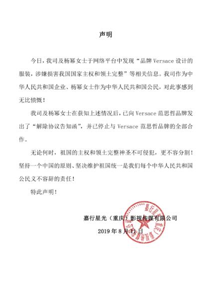 新浪娱乐讯8月11日消息,杨幂工作室发布声明,称“无论何时,中国的领土完整和主权都神圣不可侵犯,更不容分割!”表示因范思哲品牌涉嫌损害我国国家主权和领土完整,杨幂方已向其发出解除协议告知,停止与其一切合作。范思哲也就此事件回应,表示道歉,表示产品存在错误设计,“导致某些城市没有使用正确的国家名称”,称已于7月24日将相关产品在品牌方所有销售渠道下架并销毁。