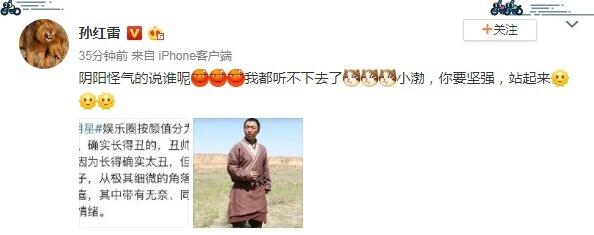 【新浪娱乐讯】12月12日,孙红雷在微博晒出一张“娱乐圈丑帅男明星”划分等级的截图,并发文调侃黄渤:“阴阳怪气的说谁呢,我都听不下去了。小渤,你要坚强,站起来。”同时还晒出一张黄渤穿着戏袍,正义凛然摆造型的照片。