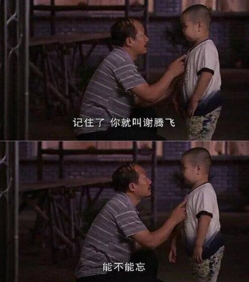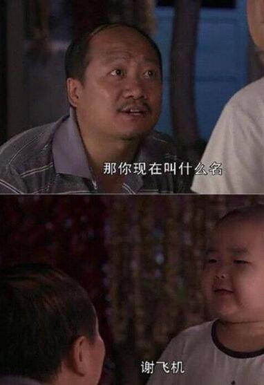 因为谢广坤给起名叫谢腾飞,然后小孩不懂就问爷爷啥叫腾飞,谢广坤说就扑棱一下子飞起来越飞越高跟飞机似的,小孩说我喜欢飞机,老谢头说你叫谢腾飞能不能忘,小孩说不能,谢广坤就问他那告诉爷爷你叫啥名,小孩说我叫谢飞机