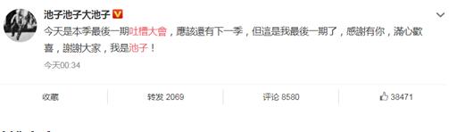 1月6日晚,第三季《吐槽大会》圆满收官,在节目片尾,池子多次喊话节目组下一季一定要请来偶像周杰伦!但是池子在微博发文感谢了节目组,透露出来的信息却是他不参加下一季《吐槽大会》了,真正原因竟然是这样