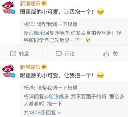 新浪娱乐官方号也评论这条微博称“限量版的小可爱,让我抱一个。”杨洋回复称“请帮我调一下权重。”新浪娱乐调皮回复”你多发自拍养号啊!杨秤砣同学自己先反思一下!”然后杨洋杨秤砣瞬间就登上了微博热搜!
