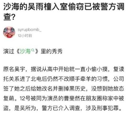 近日有网友爆料在《沙海》中饰演霍秀秀的女艺人吴雨橦因盗窃被捕!演员曹斐然发朋友圈说自己从外地回来后,发现家里遭入室盗窃,损失高达十几万,报警后发现是和她同是演员的好友吴雨橦作案,目前警方已经立案逮捕。吴雨桐,原名吴宇,据说从高中开始就一直小偷小摸,复读托关系进了北电后仍然不改顺手牵羊的习惯,公司签约她之后改名并删掉了黑历史,没想到她再次出山。12号被同为演员的曹斐然在朋友圈称家中被盗,是吴雨桐所为,警方已介入调查,涉及刑事犯罪。