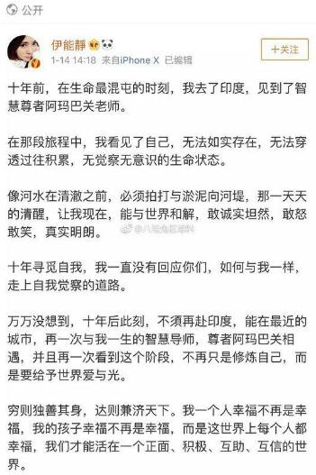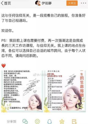 1月14日,女星伊能静晒出一条“卖课程”的微博,希望粉丝去学习一个洗涤心灵的课程。伊能静谈及自己曾在印度与智慧尊者修习的经历,称那段旅程令自己“能与世界和解,敢诚实坦然”。但她随后提到,修习这位智慧尊者的课程并不再需要远赴印度,中国大陆也有多个城市开设课程,并称“这与任何信仰无关,是一段观看自己的旅程”,同时也欢迎粉丝参加课程。