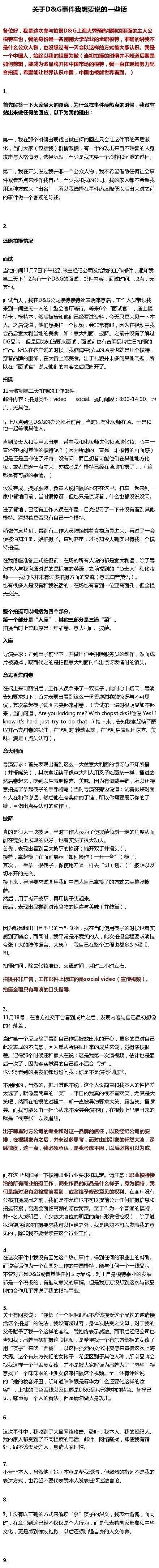 现在,时隔两个月,DG争议广告女主左也,再发声。在微博里详细地描述了当时的场面,从自己接到这个通知,到后来面试再到最后直接拍摄,并没有人跟自己详细的说明要拍摄什么。而且拍摄的过程中,都是导演说什么,自己做什么,并不是自己的随意添加。