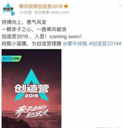 创造101》第二季官微宣布节目名称定为《创造营2019》,同时配发文案“拼搏向上,意气风发,一颗赤子之心,一路乘风破浪,创造营2019,入营!coming soon!”