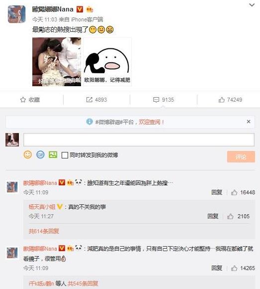 2月13日,欧阳娜娜在微博发文回应称,“最励志的热搜出现了”,配上表情包“好像是有点肉肉啦”以及“欧阳娜娜,记得减肥”。并亲自下场回应网友,“谁知道有生之年还能因为胖上热搜”“减肥真的是自己的事情,只有自己下定决心才能坚持……我现在饿了就看镜子,很管用。”
