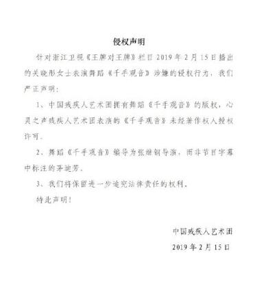 声明中称中国残疾人艺术团拥有舞蹈《千手观音》的版权,心灵之声残疾人艺术团表演的《千手观音》未经著作权人授权许可,并表示将保留进一步追究法律责任的权利。