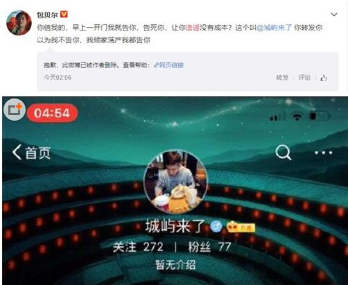 包贝尔也是直接表示自己会死磕到底,这条微博引来了包贝尔本人发博怒怼,“早上一开门我就告你,告死你,让你造谣没有成本?我倾家荡产我都告你”,和造谣者正面刚。不少网友也对包贝尔表示支持,“造谣真的无成本”“现在空口造谣的人太多了,完全不负任何责任!得让他知道后果!”目前,该网友已经删除微博。