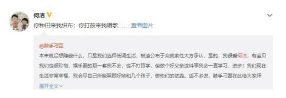 随后,该文获何洁转发并评论:“你种田来我织布;你打鼓来我唱歌……”。