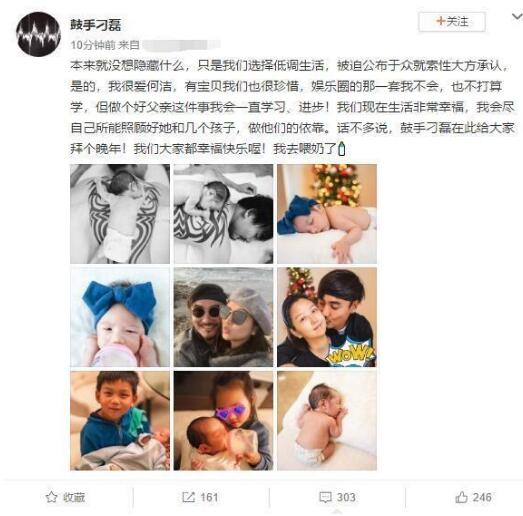 27日下午,刁磊首度发文承认了何洁诞下第三胎:“本来就没想隐藏什么,只是我们选择低调生活,被迫公布于众就索性大方承认,是的,我很爱何洁,有宝贝我们也很珍惜,娱乐圈的那一套我不会,也不打算学,但做个好父亲这件事我会一直学习、进步!我们现在生活非常幸福,我会尽自己所能照顾好她和几个孩子,做他们的依靠。话不多说,鼓手刁磊在此给大家拜个晚年!我们大家都幸福快乐喔!我去喂奶了。”