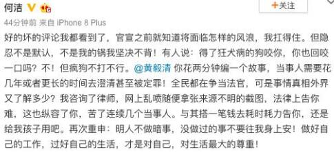 何洁否认出轨说:“好的坏的评论我都看到了,官宣之前就知道将面临怎样的风浪,我扛得住。但隐忍不是默认,不是我的锅我坚决不背!有人说:得了狂犬病的狗咬你,你也回咬一口吗?不!但疯狗不打不行。 黄毅清你花两分钟编一个故事,当事人需要花几年或者更长的时间去澄清甚至被定罪!全民都在争当法官,可是事情真相外界又了解多少?我咨询了律师,网上乱喷随便拿张来源不明的截图,法律上告你难,这也纵容了你,苦了连续几个当事人。与其搭一笔钱去耗时耗力告你,还是给我孩子用吧。再次重申:明人不做暗事,没做过的事不要往我身上安!做好自己的工作,过好自己的生活,才是对自己,对生活最大的尊重!”