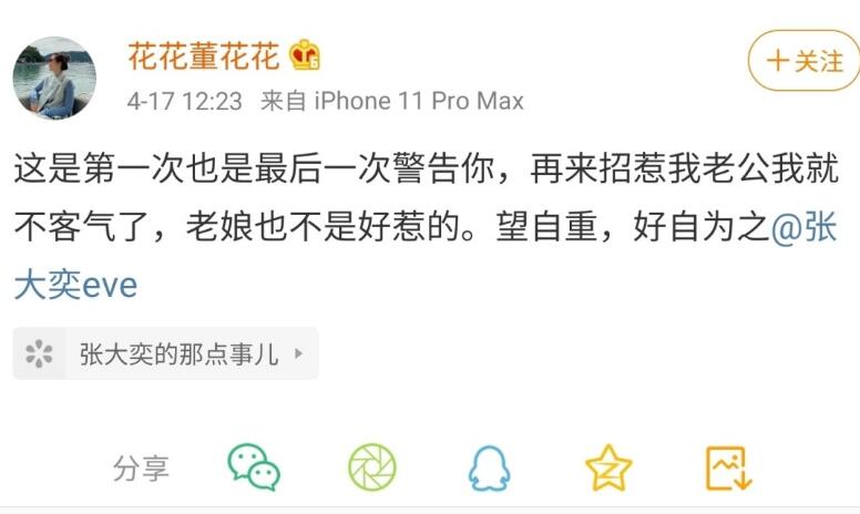 4月17日,一位天猫总裁夫人在微博开撕张大奕:“再来招惹我老公我就不客气了,老娘也不是好惹的。”