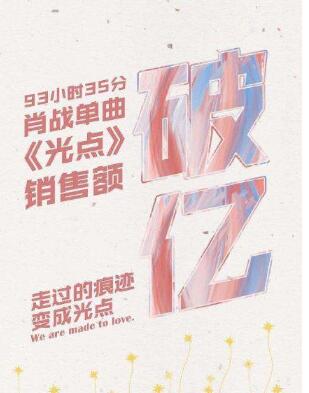 肖战新歌《光点》,历时93小时35分,全网销售额突破1亿大关,销量突破3000万,成为全网单曲销量及销售额第一。