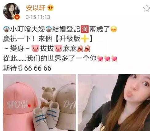 3月15日,演员安以轩在微博写下一段俏皮话,宣布怀孕喜讯:“小叮当夫妇结婚登记满两岁了!庆祝一下升级版变身猪拔拔猪麻麻,从此我们的世界多了一个你,期待666666”。据悉,安以轩丈夫陈荣炼外号叫“65”,因此宝宝小名就叫“66”,两人的金猪宝宝预产期在七八月之间。